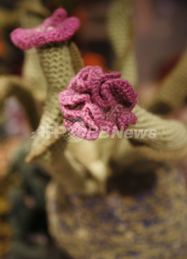3歳から101歳まで約800人の女性に数人の男性も加わり、複雑によじれたサンゴの枝やイソギンチャク、ヒトデなどを毛糸で編み上げた。中には、リサイクル素材を活用した作品や、高さ3メートルに達する大作もある。(c)AFP/Virginie Montet