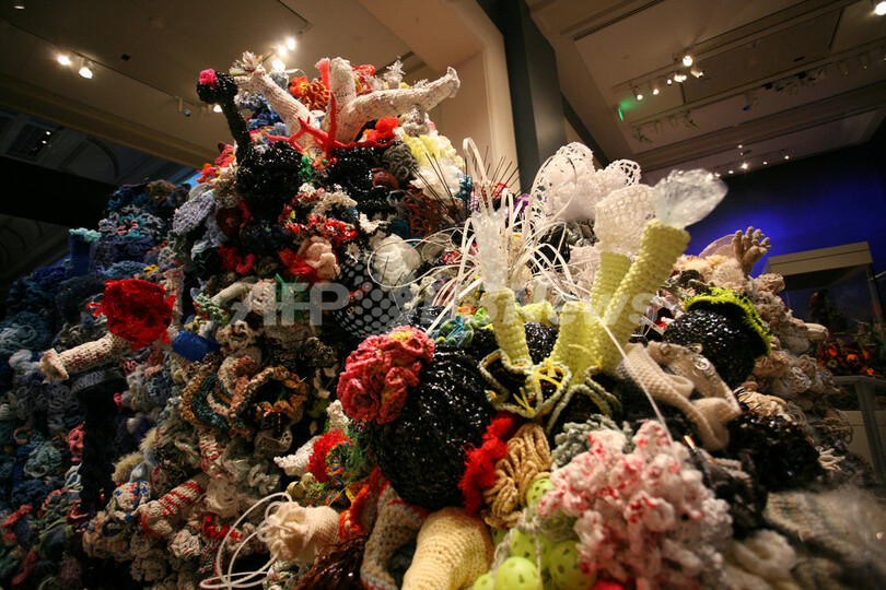 3歳から101歳まで約800人の女性に数人の男性も加わり、複雑によじれたサンゴの枝やイソギンチャク、ヒトデなどを毛糸で編み上げた。中には、リサイクル素材を活用した作品や、高さ3メートルに達する大作もある(2010年10月14日撮影)。(c)AFP/Virginie Montet/Kimihiro Hoshino