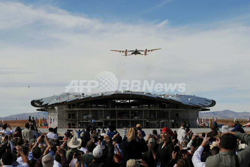 写真は、「スペースポート・アメリカ」で格納庫上空を飛行する「VSSエンタープライズ」(2010年10月22日撮影)。(c)AFP/Paula Bustamante/Mark RALSTON