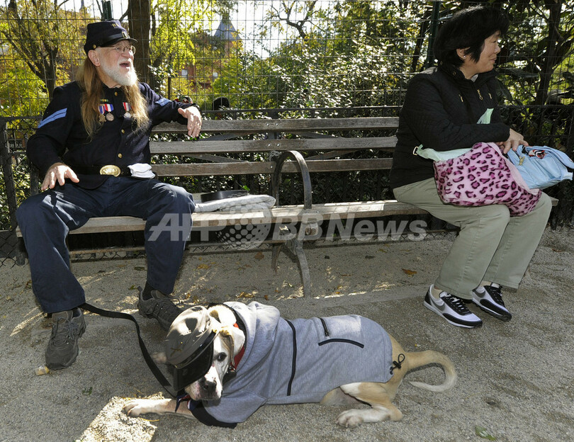 写真は、飼い主と一休みするパレードの参加犬(2010年10月23日撮影)。(c)AFP/TIMOTHY A. CLARY