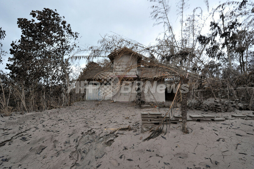 写真は、ムラピ山の噴火で火山灰をかぶったジャワ島スレマン(Sleman)地区カリ・アデム(Kali Adem)村の家(2010年10月28日撮影)。(c)AFP/ADEK BERRY