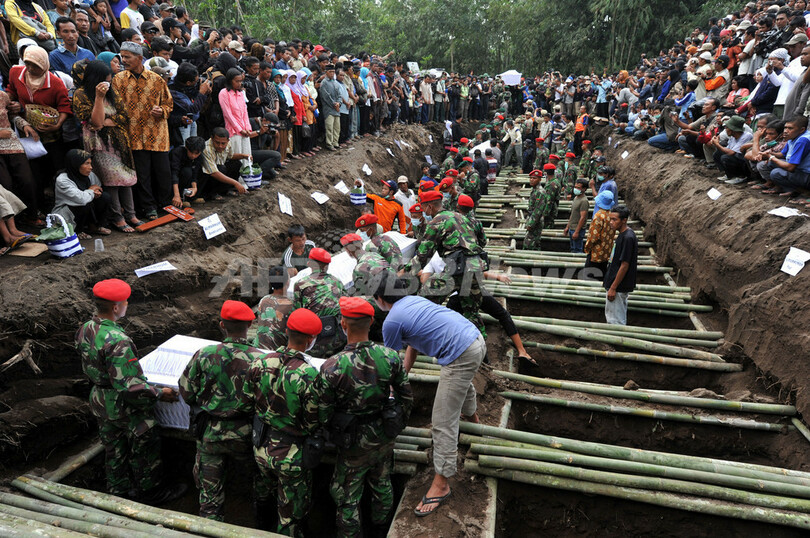 写真は、ジャワ島スレマン(Sleman)地区シドレジョ(Sidorejo)村で行われたムラピ(Merapi)山の噴火による犠牲者の葬儀(2010年10月28日撮影)。(c)AFP/ADEK BERRY