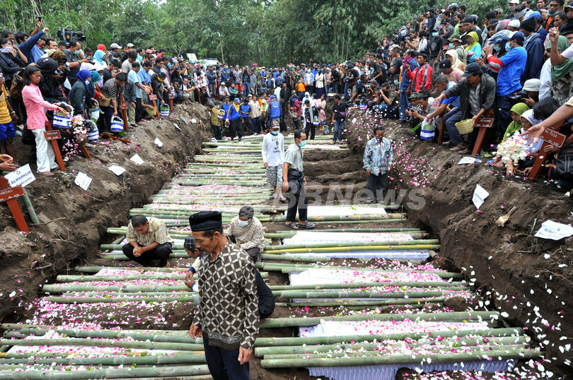 写真は、ジャワ島スレマン(Sleman)地区シドレジョ(Sidorejo)村で行われたムラピ(Merapi)山の噴火による犠牲者の葬儀(2010年10月28日撮影)。(c)AFP/ADEK BERRY