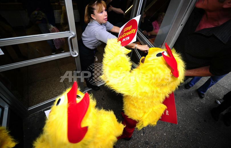 写真はマクドナルド店舗前で、従業員に抗議するPETAメンバーら(2010年10月28日撮影)。(c)AFP/Emmanuel Dunand
