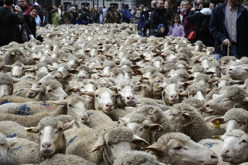 写真は、マドリード市街地を移動する羊の大群(2010年10月31日撮影)。(c)AFP/DOMINIQUE FAGET