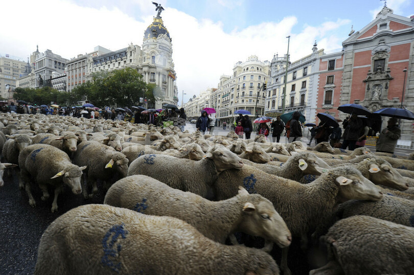 写真は、マドリード市街地を移動する羊の大群(2010年10月31日撮影)。(c)AFP/DOMINIQUE FAGET