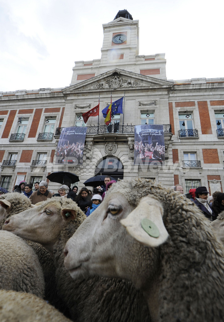 写真は、マドリード・プエルタ・デル・ソル(Puerta del Sol)を埋め尽くす羊の大群(2010年10月31日撮影)。(c)AFP/DOMINIQUE FAGET
