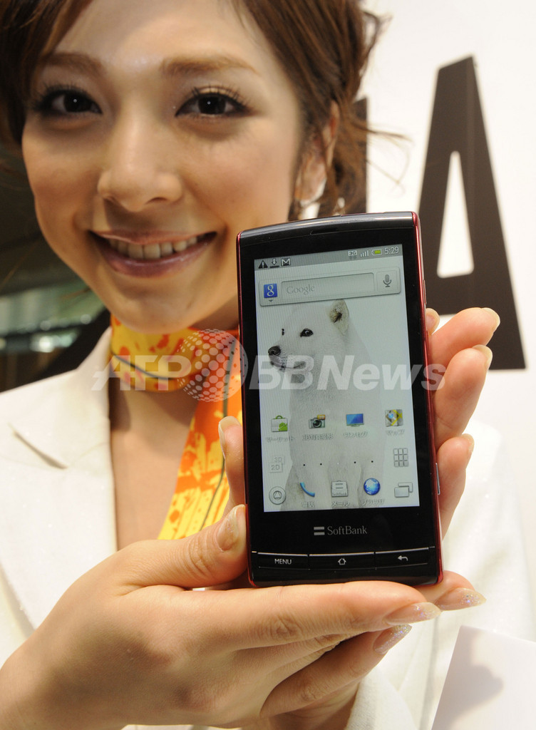 写真は新製品発表会で「GALAPAGOS 003SH」を紹介する女性モデル(2010年11月4日撮影)。(c)AFP/Yoshikazu TSUNO