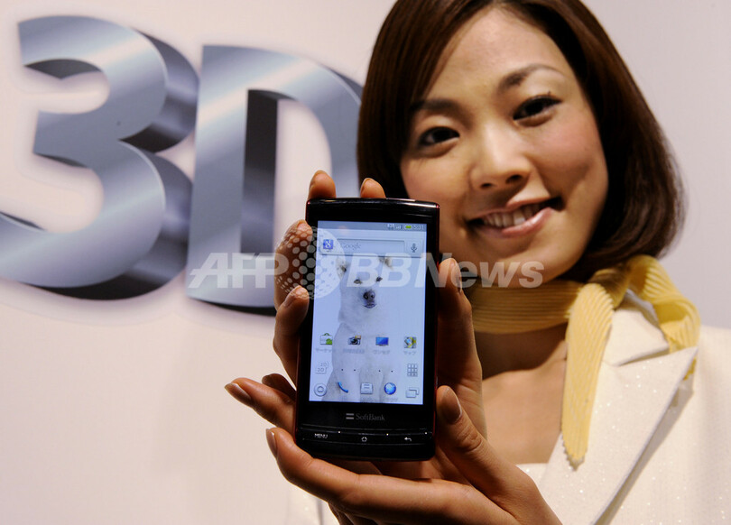 【11月4日 AFP】ソフトバンクモバイル(Softbank Mobile)は4日、都内で新製品発表会を開いた。シャープ(Sharp)製の携帯電話端末「GALAPAGOS 003SH」は搭載した3.8インチの液晶ディスプレイで3D画像を楽しめる。12月上旬以降発売予定。(c)AFP