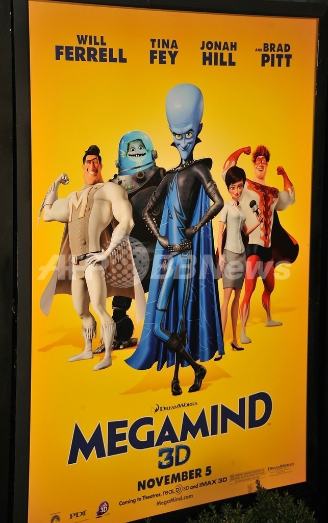 ブラッド・ピット(Brad Pitt)やティナ・フェイ(Tina Fey)らが声優を務めるアニメ『メガマインド(Megamind)』のプレミア上映会が3日、ニューヨーク(New York)で行われ、関係者が出席した。写真は、同作品のポスター(2010年11月3日撮影)。(c)AFP/Getty Images/Slaven Vlasic