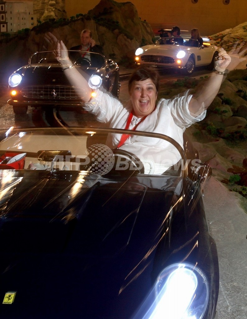 アトラクションは20種類あり、目玉はF1マシンを運転している気分を味わえる世界最速のジェットコースター「フォーミュラ・ロッサ(Formula Rossa)」だ。最高時速は240キロに達するという。写真は、フェラーリ・ワールドのゴーカートを楽しむ女性(2010年10月27日撮影)(c)AFP/STR