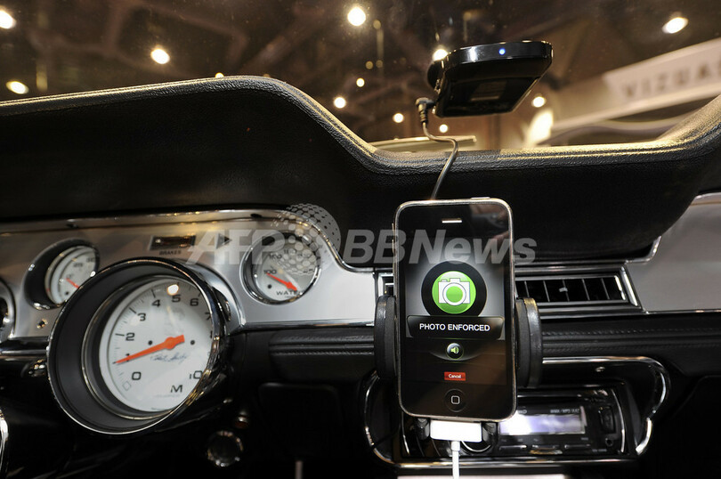 【11月8日 AFP】ラスベガス(Las Vegas)で開催された自動車アクセサリー用品展示会「SEMA」に出展された、運転中に速度違反取り締まり装置などの「トラップ」の存在を教えてくれるiPhone用アプリ「Cobra iRadar」。