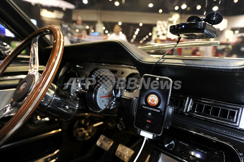 【11月8日 AFP】ラスベガス(Las Vegas)で開催された自動車アクセサリー用品展示会「SEMA」に出展された、運転中に速度違反取り締まり装置などの「トラップ」の存在を教えてくれるiPhone用アプリ「Cobra iRadar」。