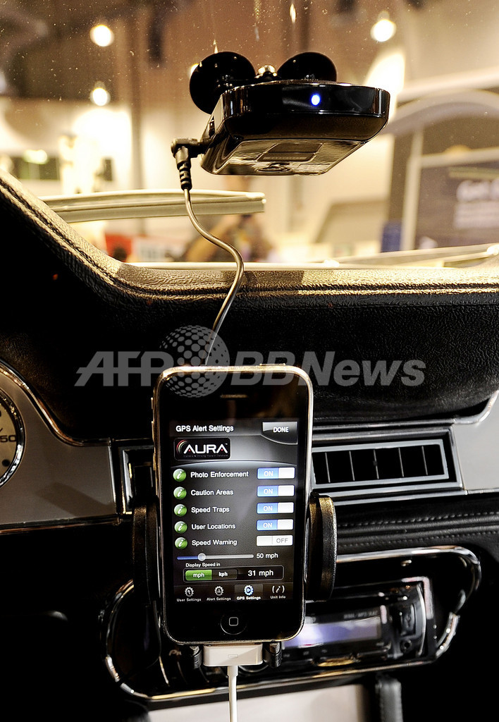 【11月8日 AFP】ラスベガス(Las Vegas)で開催された自動車アクセサリー用品展示会「SEMA」に出展された、運転中に速度違反取り締まり装置などの「トラップ」の存在を教えてくれるiPhone用アプリ「Cobra iRadar」。