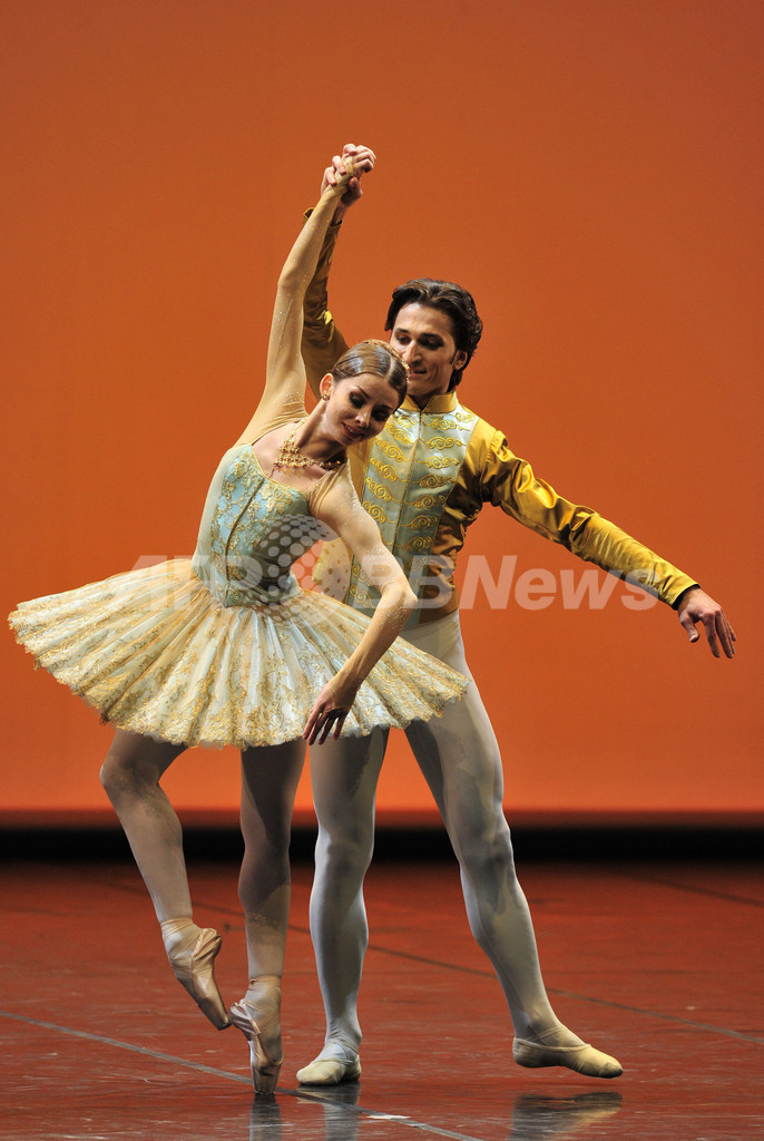 ドイツ・ベルリン(Berlin)で9日、ダンサー/振付家のウラジーミル・マラーホフ(Vladimir Malakhov)を筆頭とするバレエダンサーが競演する「Malakhov and Friends」の報道陣向けのパフォーマンスが公開された。公演は10日から。写真は、「ベニスのカーニバル」を踊るエフゲーニャ・オブラスツォーワ(Yevgenia Obraztsova)とディニュー・タマツラカル(Dinu Tamazlacaru、2010年11月9日撮影)。(c)AFP/JOHN MACDOUGALL