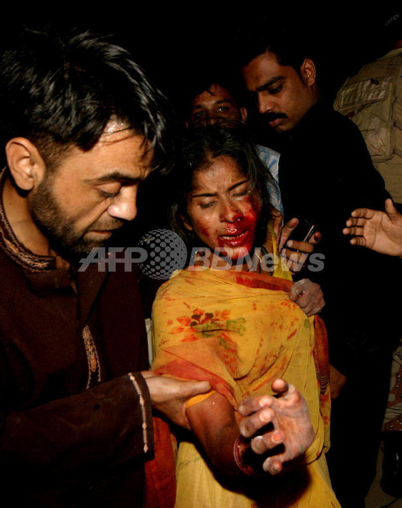 写真は、爆弾で破壊された現場から救出される女性(2010年11月11日撮影)。(c)AFP/RIZWAN TABASSUM
