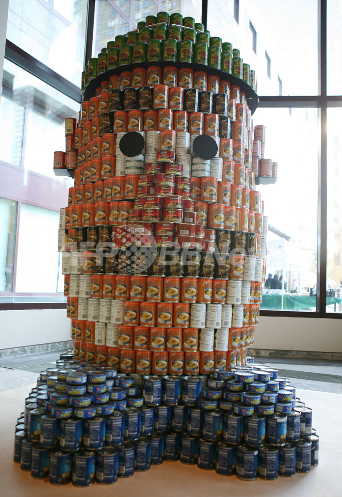 【11月12日 AFP】缶詰食品で作ったアートの展示会が11日、ニューヨーク(New York)のワールド・フィナンシャル・センター(World Financial Center)で始まった。作品のデザインコンテストも同時に行われている。展示終了後、解体された缶詰は慈善団体「シティー・ハーベスト」を通じて恵まれないニューヨーク市民へ提供される。(c)AFP