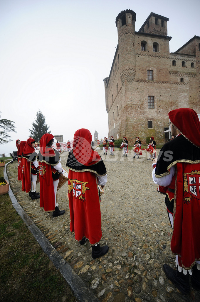 写真は、競売の開催に合わせて中世の姿に扮した音楽隊や関係者ら(2010年11月14日撮影)。(c)AFP/Filippo MONTEFORTE