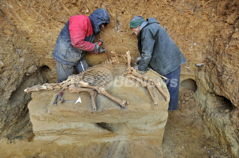 ニュース ライフ 完ぺきな姿で発見、10万年前の馬の化石 2010年11月17日 20:53 発信地:フランス [ ヨーロッパ フランス ] このニュースをシェア ‹ › ❮ 3/7 ❯ 写真は、化石の発掘作業を行う考古学者ら(2010年11月16日撮影)。(c)AFP/THIERRY ZOCCOLAN 画像作成中 ! 【11月17日 AFP】フランス中部モリア(Moriat)の農地で、先史時代の馬の骨の化石が見つかった。農民が地下2メートルの深さから発見したこの化石は、10万年以上前のものであるにもかかわらず完璧な形を残しており、考古学の分野では非常に珍しい発見とされている。(c)AFP ライフ 一覧へ> メディア・報道関係・法人の方向け 写真・動画 購入のお問合せ>
