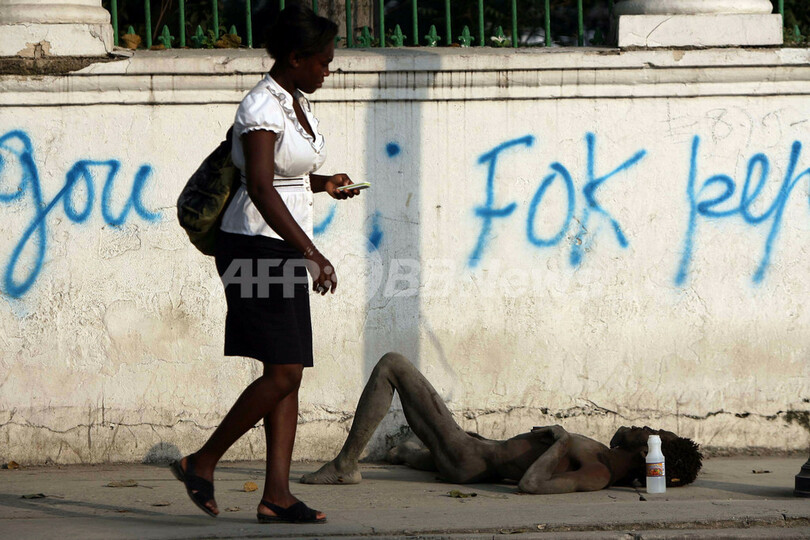 コレラ感染者が治療を受けるハイチの首都ポルトープランス(Port-au-Prince)の病院前で、意識を失い裸で横たわる男性(2010年11月16日撮影)。(c)AFP/Hector RETAMAL