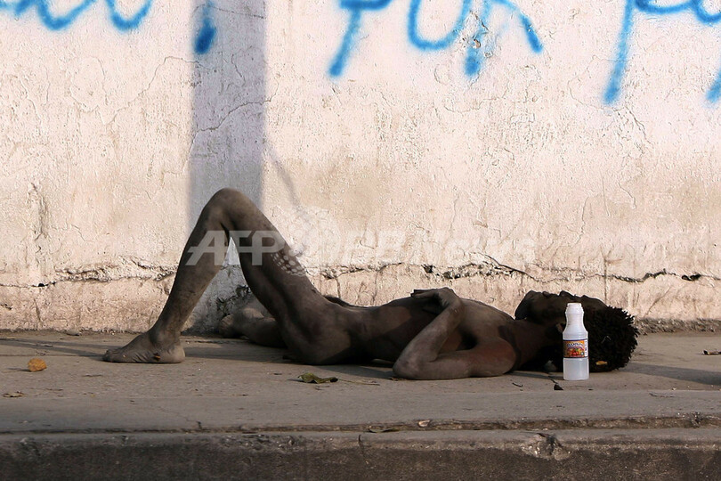 コレラ感染者が治療を受けるハイチの首都ポルトープランス(Port-au-Prince)の病院前で、意識を失い裸で横たわる男性(2010年11月16日撮影)。(c)AFP/Hector RETAMAL
