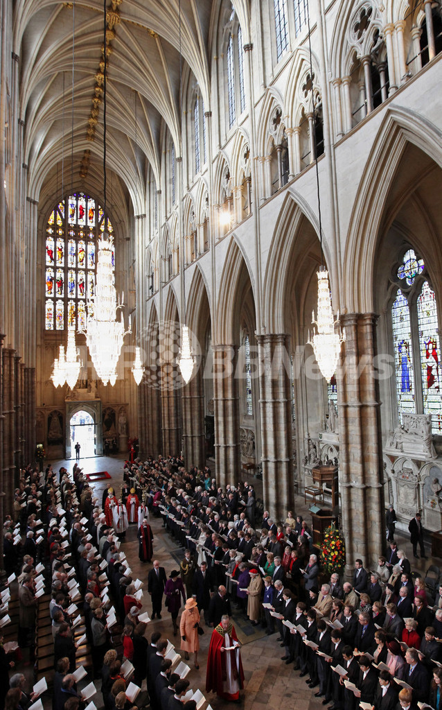 英国会議事堂の隣に構えるウェストミンスター寺院は、1066年の征服王ウィリアム(William the Conqueror)以来、英国君主の戴冠式の場として定着した。17人の君主の墓もここにある。またエリザベス女王(Queen Elizabeth)は1947年、現在のフィリップ殿下(Prince Philip)とここで結婚した。アン王女(Princess Anne)とアンドリュー王子(Prince Andrew)もここで挙式しているが、この2人は離婚している。(c)AFP/Robin Millard