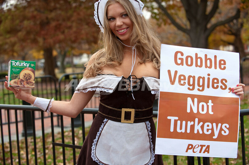 ニュース ライフ 今回のPETAはメイドさん、「七面鳥食べないで!」 2010年11月25日 11:44 発信地:ワシントンD.C./米国 [ 北米 米国 ] このニュースをシェア ‹ › ❮ 2/6 ❯ ホワイトハウスの前でプラカードを掲げ、トーファーキーを配るPETAの活動家(2010年11月23日撮影)。(c)AFP/Nicholas KAMM 画像作成中 ! 【11月25日 AFP】25日の感謝祭を前に、動物愛護団体PETA(動物の倫理的扱いを求める人々の会)の活動家が23日、ホワイトハウスの前で、七面鳥ではなく「トーファーキー(七面鳥の丸焼きに似せた豆腐)」を食べるよう訴える活動を行った。(c)AFP ライフ 一覧へ> メディア・報道関係・法人の方向け 写真・動画 購入のお問合せ>