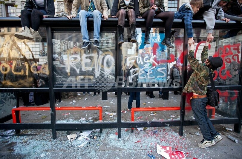 写真はロンドンで、暴徒化したデモ隊に破壊されたバス停(2010年11月24日撮影)。(c)AFP/Danny Kemp and Alice Ritchie/WARREN ALLOTT