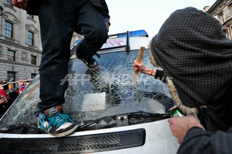 写真はロンドン・ホワイトホールで、警察車両を襲撃する暴徒化したデモ隊(2010年11月24日撮影)。(c)AFP/Danny Kemp and Alice Ritchie/CARL COURT