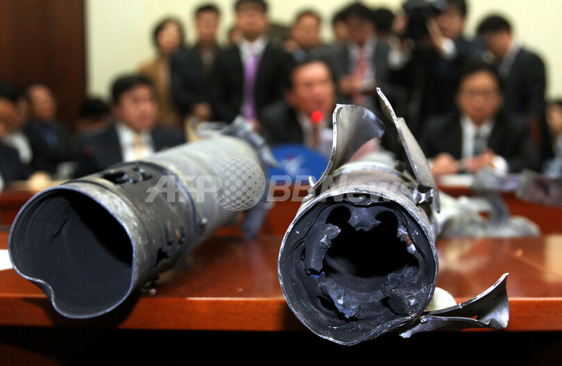 写真は、ソウル(Seoul)にある国会で与党ハンナラ党(Grand National Party)が公開した、北朝鮮が打ち込んだ砲弾の残がい(2010年11月25日撮影)。(c)AFP/DONG-A ILBO