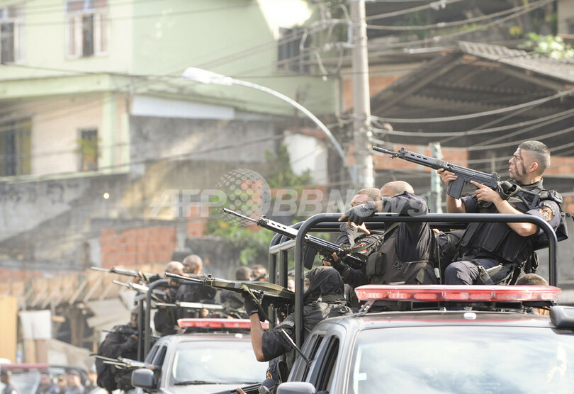 リオ北部に広がるスラム街コンプレクソ・ド・アレマン(Complexo do Alemao)では、2014年のサッカーW杯と2016年の五輪開催を控えて前例のない大規模な掃討作戦が展開されている。28日未明から始まったグロタ地区の制圧作戦には、ヘリコプターや装甲車の支援のもと、警察部隊のほか空挺(くうてい)部隊や海兵隊も投入された。