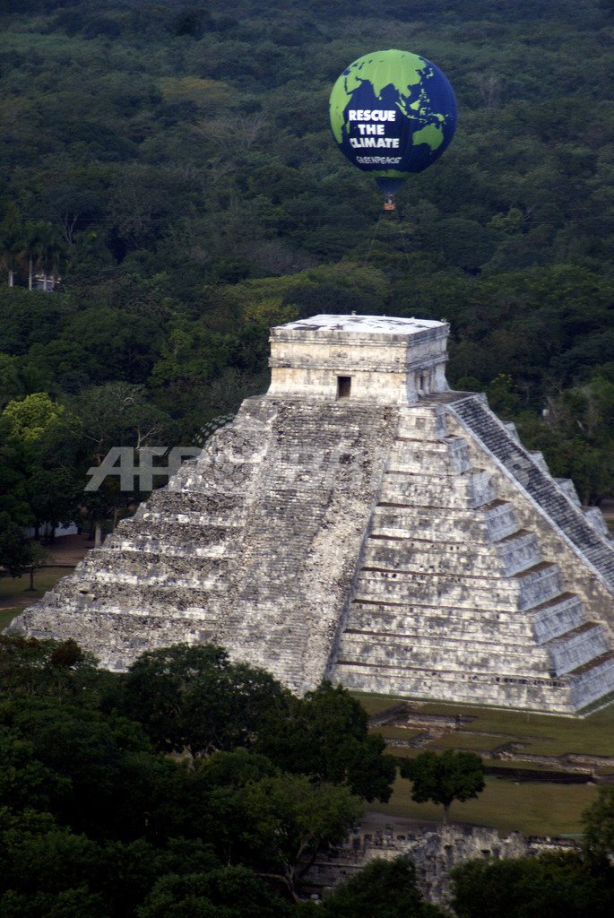 メキシコでの国連気候変動枠組み条約(UN Framework Convention on Climate Change、UNFCCC)第16回締約国会議(COP16)の開催を前に、環境保護団体グリーンピース(Greenpeace)は前月28日、ユカタン(Yucatan)州チチェンイツァ(Chichen Itza)の古代遺跡「ククルカン(Kukulkan)ピラミッド」上空に熱気球を上げた。「気候を救おう」とのメッセージが書かれている。COP16は11月29日から12月10日までの日程で開かれる(2010年11月28日撮影)。(c)AFP/Luis Perez