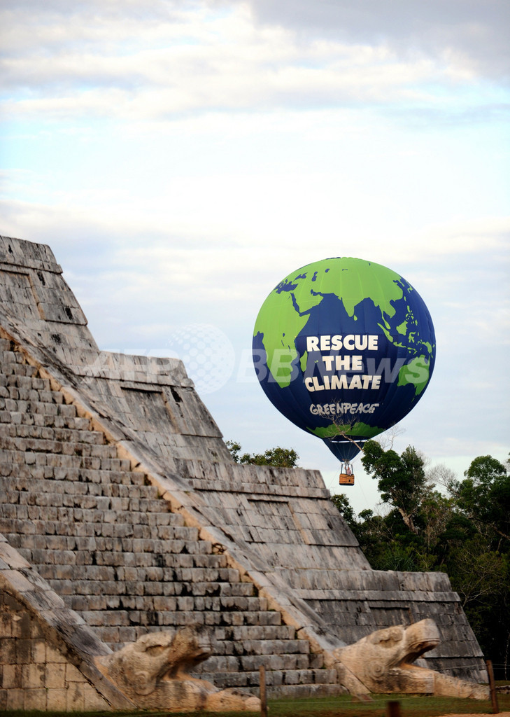 メキシコでの国連気候変動枠組み条約(UN Framework Convention on Climate Change、UNFCCC)第16回締約国会議(COP16)の開催を前に、環境保護団体グリーンピース(Greenpeace)は前月28日、ユカタン(Yucatan)州チチェンイツァ(Chichen Itza)の古代遺跡「ククルカン(Kukulkan)ピラミッド」上空に熱気球を上げた。「気候を救おう」とのメッセージが書かれている。COP16は11月29日から12月10日までの日程で開かれる(2010年11月28日撮影)。(c)AFP/Luis Perez