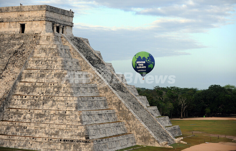 メキシコでの国連気候変動枠組み条約(UN Framework Convention on Climate Change、UNFCCC)第16回締約国会議(COP16)の開催を前に、環境保護団体グリーンピース(Greenpeace)は前月28日、ユカタン(Yucatan)州チチェンイツァ(Chichen Itza)の古代遺跡「ククルカン(Kukulkan)ピラミッド」上空に熱気球を上げた。「気候を救おう」とのメッセージが書かれている。COP16は11月29日から12月10日までの日程で開かれる(2010年11月28日撮影)。(c)AFP/Luis Perez