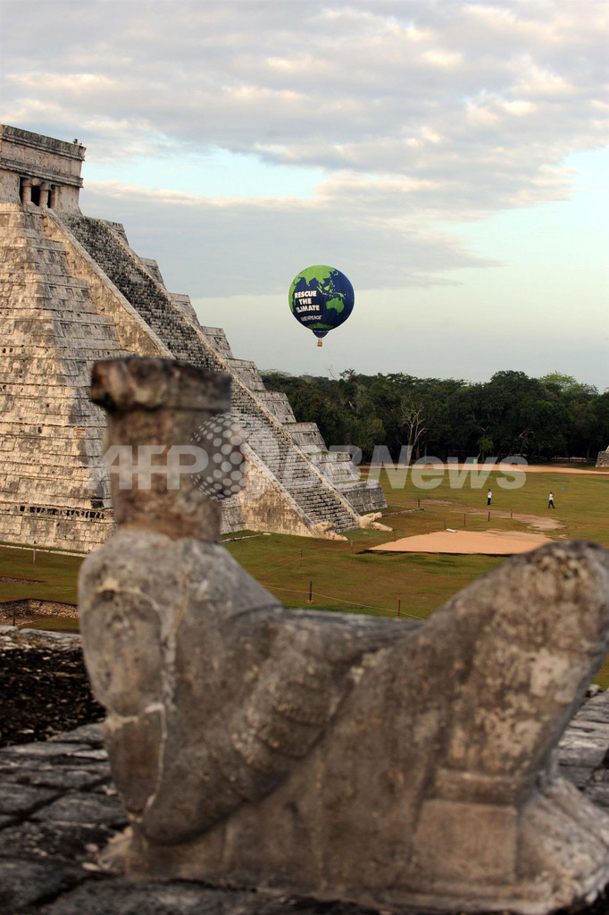 メキシコでの国連気候変動枠組み条約(UN Framework Convention on Climate Change、UNFCCC)第16回締約国会議(COP16)の開催を前に、環境保護団体グリーンピース(Greenpeace)は前月28日、ユカタン(Yucatan)州チチェンイツァ(Chichen Itza)の古代遺跡「ククルカン(Kukulkan)ピラミッド」上空に熱気球を上げた。「気候を救おう」とのメッセージが書かれている。COP16は11月29日から12月10日までの日程で開かれる(2010年11月28日撮影)。(c)AFP/Luis Perez