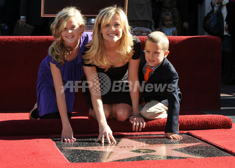 写真は、2人の子どもとともに式典に出席したウィザースプーン(2010年12月1日撮影)。(c)AFP/Mark RALSTON