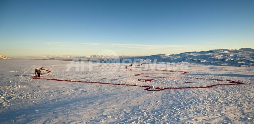 【12月3日 AFP】アイスランドのラングヨークトル(Langjokull)氷河の麓に、食紅で描かれた巨大なホッキョクグマの絵が出現した。ビジュアルアーティスト、Bjargey Olafsdottir氏の作品で、消えつつある氷河と先の見えないホッキョクグマの将来に光を当てることを目的に描かれた。ペルー・ナスカ(Nazca)の地上絵と子どもの落書きから着想を得たという。(c)AFP