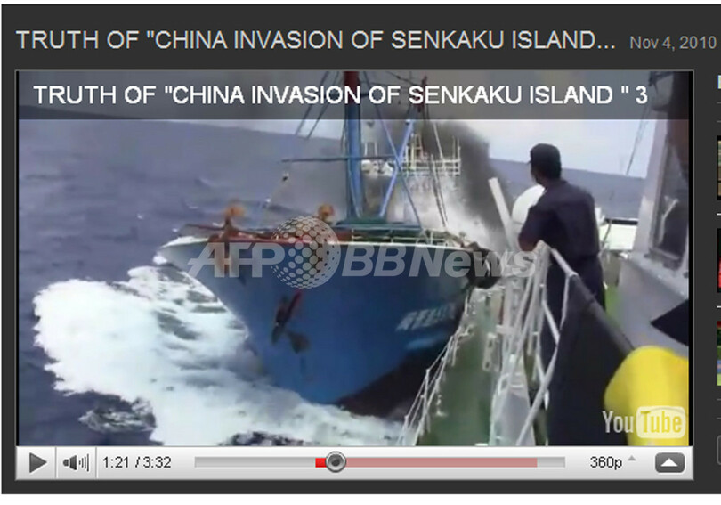 動画共有サイト、ユーチューブ(YouTube)に投稿された、尖閣諸島(Senkaku Islands、中国名:釣魚島)沖で起きた中国漁船と海上保安庁(Japan Coast Guard)巡視船の衝突を撮影したビデオの一部(2010年11月5日撮影)。(c)AFP/YouTube