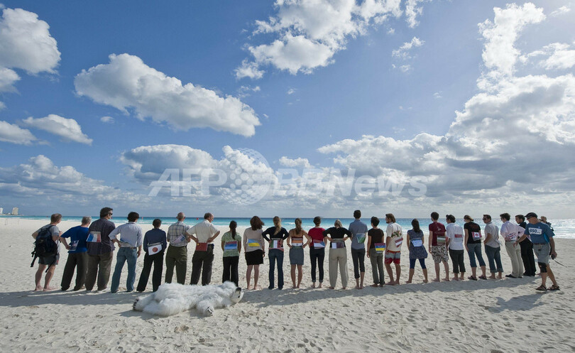 【12月6日 AFP】国連気候変動枠組み条約第16回締約国会議(COP16)が開かれているメキシコ・カンクン(Cancun)の海岸で3日、自然保護団体シエラクラブ(Sierra Club)が気候変動問題への取り組みを避けていると主張する国に対し、ホッキョクグマの着ぐるみを着るなどして抗議デモを行った。(c)AFP