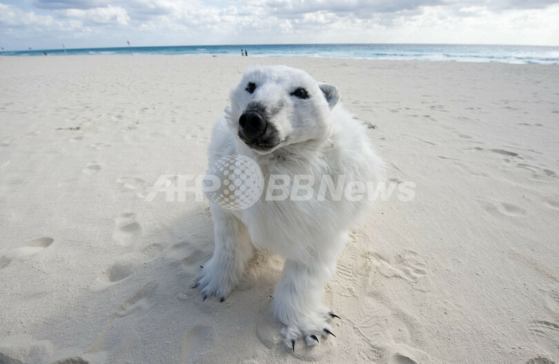 【12月6日 AFP】国連気候変動枠組み条約第16回締約国会議(COP16)が開かれているメキシコ・カンクン(Cancun)の海岸で3日、自然保護団体シエラクラブ(Sierra Club)が気候変動問題への取り組みを避けていると主張する国に対し、ホッキョクグマの着ぐるみを着るなどして抗議デモを行った。(c)AFP