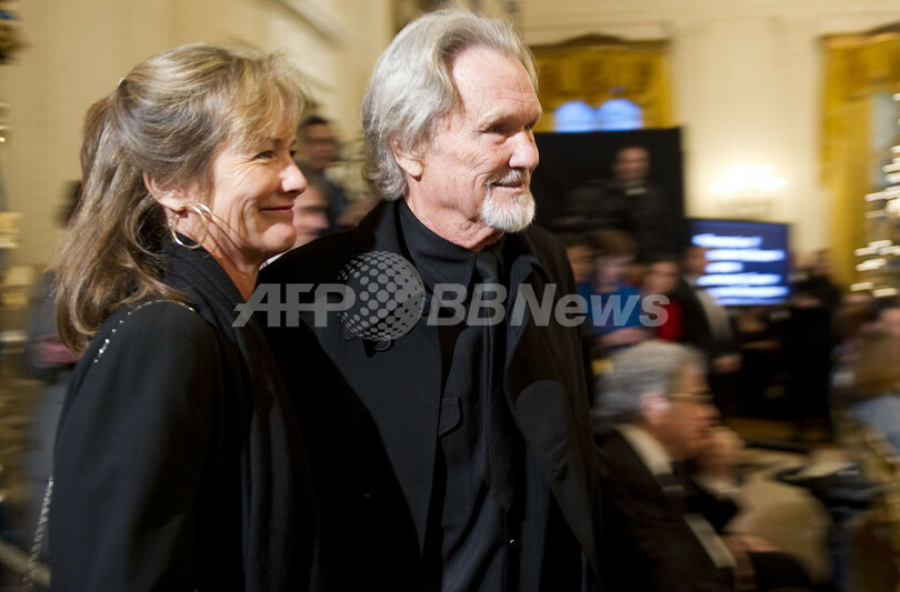 写真は、式が行われたホワイトハウスの東の間(East Room)に到着した俳優クリス・クリストファーソン(Kris Kristofferson)さん(右)と夫人(2010年12月5日撮影)。(c)AFP/Jim WATSON