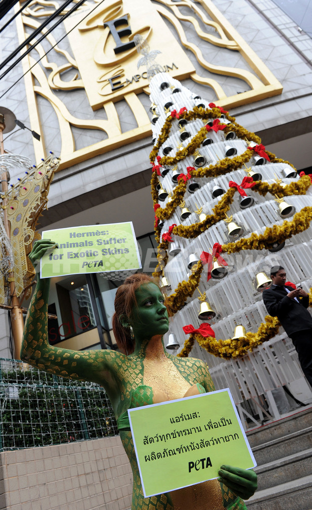 ニュース 環境・科学 こぼれ話 皮革ブランド製品に「ヘビ女」がNO!PETA 2010年12月10日 11:59 発信地:バンコク/タイ [ アジア・オセアニア タイ ] このニュースをシェア ‹ › ❮ 3/4 ❯ タイ・バンコク(Bangkok)で、全身をヘビに見立てたボディーペインティングをして仏高級ブランド「エルメス(Hermes)」の皮革利用に抗議する、動物愛護団体PETA(動物の倫理的扱いを求める人々の会)の活動家(2010年12月8日撮影)。(c)AFP/Christophe ARCHAMBAULT 画像作成中 ! 【12月10日 AFP】タイ・バンコク(Bangkok)のショッピングモール前で8日、全身をヘビに見立てたボディーペインティングをほどこした動物愛護団体PETA(動物の倫理的扱いを求める人々の会)の活動家が、希少動物の皮革を利用した高級ブランド製品に反対するデモを行った。デモは特に仏高級ブランド「エルメス(Hermes)」をターゲットにしたものだという。(c)AFP 環境・科学 一覧へ> メディア・報道関係・法人の方向け 写真・動画 購入のお問合せ>