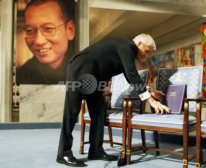 【12月11日 AFP】2010年ノーベル平和賞授賞式が10日、ノルウェーのオスロ(Oslo)で行われ、ノルウェー・ノーベル賞委員会(Norwegian Nobel Committee)のトルビョルン・ヤーグラン(Thorbjoern Jagland)委員長が中国の民主活動家、劉暁波(Liu Xiaobo)氏(54)に贈られたメダルと賞状を、無人の座席の上に置いた。劉氏は中国で実刑判決を受け、現在も収監中だ。