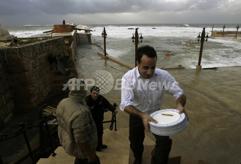 暴風雨に襲われたレバノンとイスラエルの沿岸では、風速28メートルの強風が吹き荒れ、波の高さは10メートルに達した。エジプト・アレクサンドリア(Alexandria)では、豪雨により人口密集地区にある工場が倒壊し、少なくとも3人が死亡した。地中海南東岸ではこのところ、例年になく気温が高く、雨の降らない状況が続いていた。(c)AFP/Boncompagni