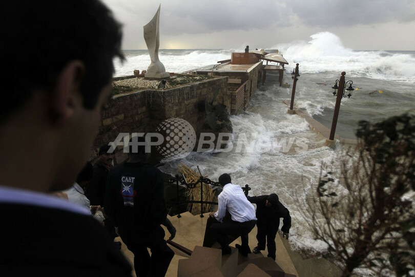 暴風雨に襲われたレバノンとイスラエルの沿岸では、風速28メートルの強風が吹き荒れ、波の高さは10メートルに達した。エジプト・アレクサンドリア(Alexandria)では、豪雨により人口密集地区にある工場が倒壊し、少なくとも3人が死亡した。地中海南東岸ではこのところ、例年になく気温が高く、雨の降らない状況が続いていた。(c)AFP/Boncompagni