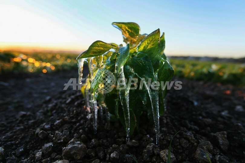 米東部を襲った記録的な寒波は、温暖なフロリダ州にも及び、気温は氷点下近くまで落ち込んだ。このため同州の農家では、水をまくなどして農作物を凍結被害から保護している。(c)AFP