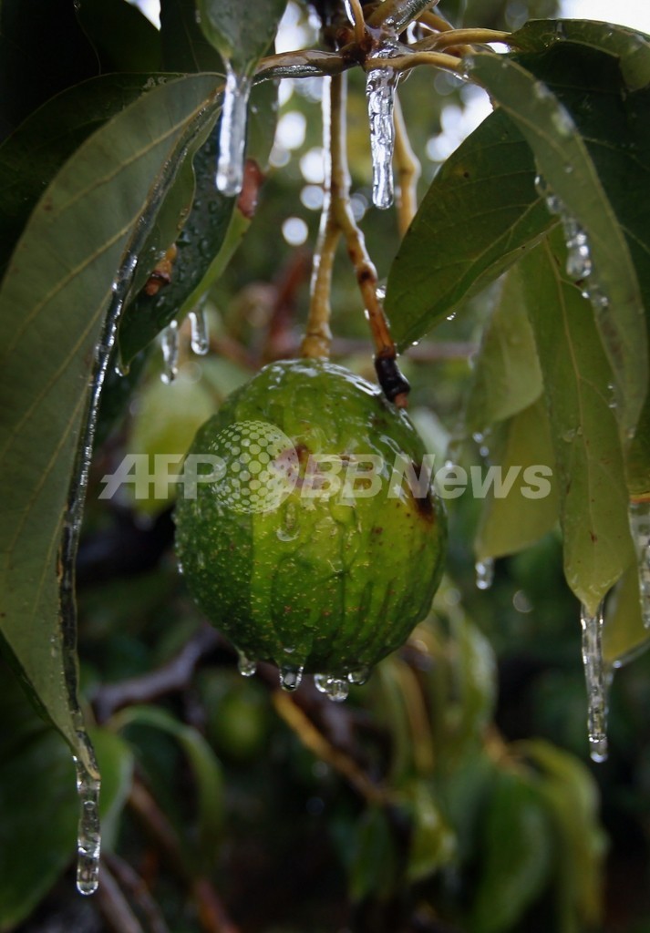 【12月16日 AFP】米南部フロリダ(Florida)州で、アボカドの実から下がるつらら。