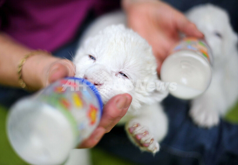 ニュース ライフ こぼれ話 ホワイトライオンの双子、元気に育ってます ドイツ 2010年12月16日 20:42 発信地:ホーデンハーゲン/ドイツ [ ヨーロッパ ドイツ ] このニュースをシェア ‹ › ❮ 4/5 ❯ ドイツ・ホーデンハーゲン(Hodenhagen)にあるセレンゲティ公園(Serengeti Park)で、哺乳瓶からミルクを飲むホワイトライオンの赤ちゃん、ニーザ(Niza、左)とネロ(Nero、2010年12月15日撮影)。(c)AFP/JOCHEN LUEBKE 画像作成中 ! 【12月16日 AFP】ドイツ北部ホーデンハーゲン(Hodenhagen)のセレンゲティ公園(Serengeti Park)で、生後2週間のホワイトライオンの双子が元気に育っている。ネロ(Nero)とニーザ(Niza)の兄妹は2日、帝王切開で誕生した。現在は動物園の係員が哺乳瓶で授乳し2匹を育てており、動物園の環境に慣れたころに、園内の仲間のライオンの群れに放たれる予定だ。(c)AFP ライフ 一覧へ> メディア・報道関係・法人の方向け 写真・動画 購入のお問合せ>
