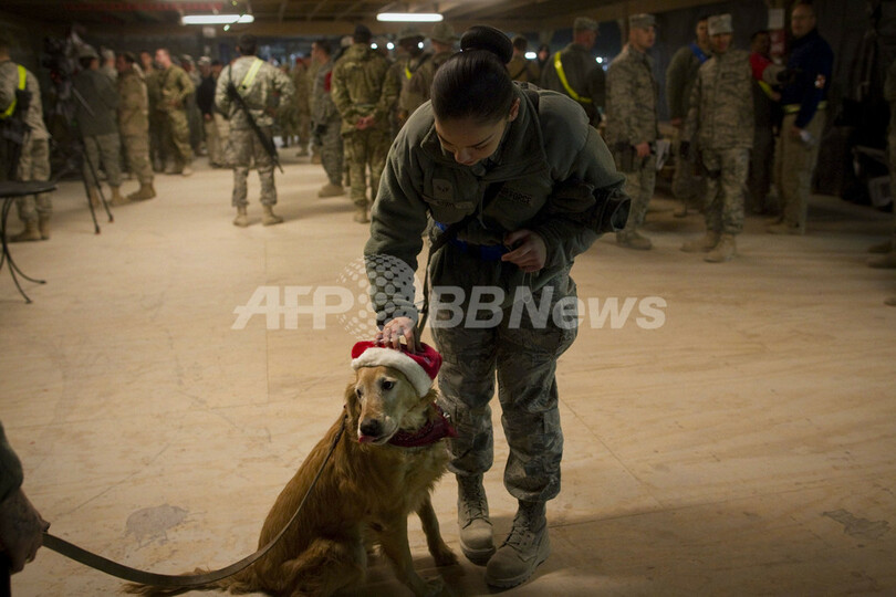 写真はクリスマス用の衣装を着たイヌと遊ぶ米軍兵士(2010年12月16日撮影)。(c)AFP/BEHROUZ MEHRI