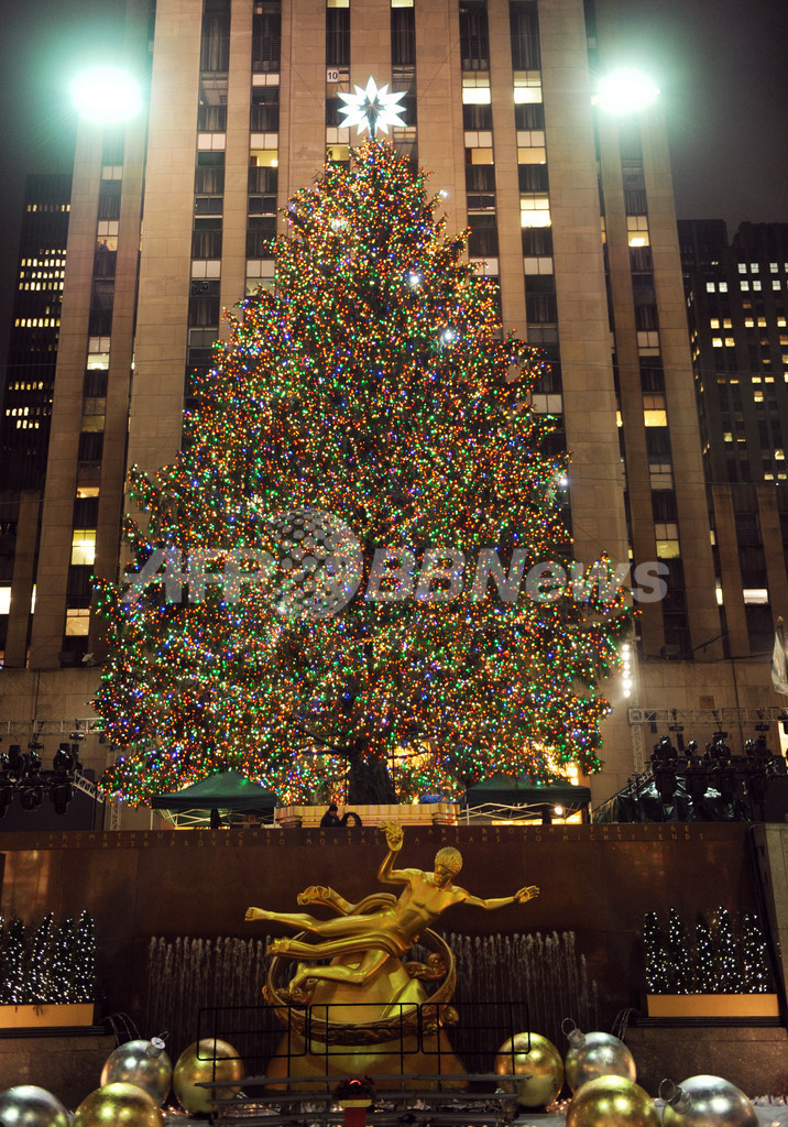 クリスマスシーズンを彩るクリスマスツリー。欧米諸国はもちろん、今やイスラム教の国々でも欠かせない冬の風物詩となっている。写真は、米ニューヨーク(New York)・ロックフェラーセンター(Rockefeller Center)前のクリスマスツリー。電飾には環境にやさしいLEDライトが3万個使われ、先端に取り付けられた星はスワロフスキー(Swarovski)のクリスタルガラスだ(2010年11月30日撮影)。(c)AFP/Stan Honda